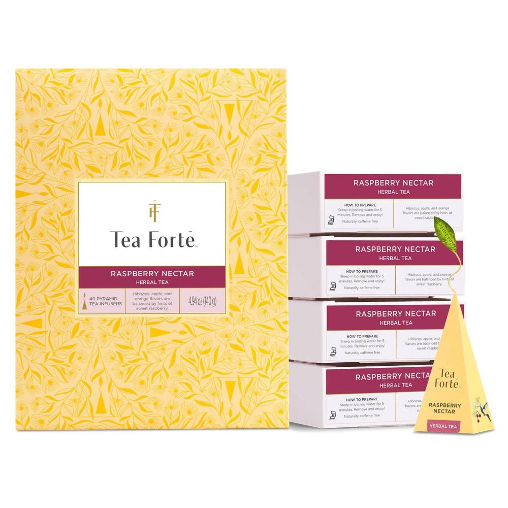 Tea Forte Raspberry Nectar Premium Caffeine-Free Herbal Tea Blend Event Box, Bulk Pack 40 Count, 10 per tray Individually Wrapped Handcrafted Pyramid Infusers(Raspberry Nectar)