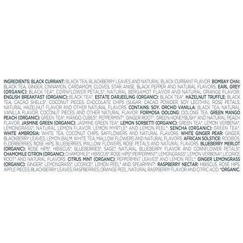TEA BLENDS – 40 pyramid infusers with 2 of each herbal tea blend: African Solstice, Apricot Amaretoo, Belgian Mint, Blueberry Merlot, Cherry Cosmo, Chocolate Fonude, Citrus Mint, Ginger Lemongrass, Hibiscus Blossom, Lemon Lavendar, Mango Citron, Mojito Marmalade, Pink Papaya Nectar, Purify, Radiance, Raspberry Nectar, Serenity, Strawberry Apple, Wild Berry Hibiscus, and Winter Chai.