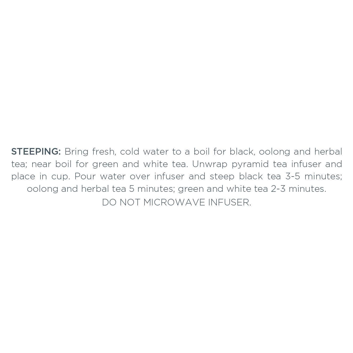 HOW TO STEEP – Unwrap the Pyramid Infuser, place into 8 ounces of boiled water. Do not microwave pyramid infuser.