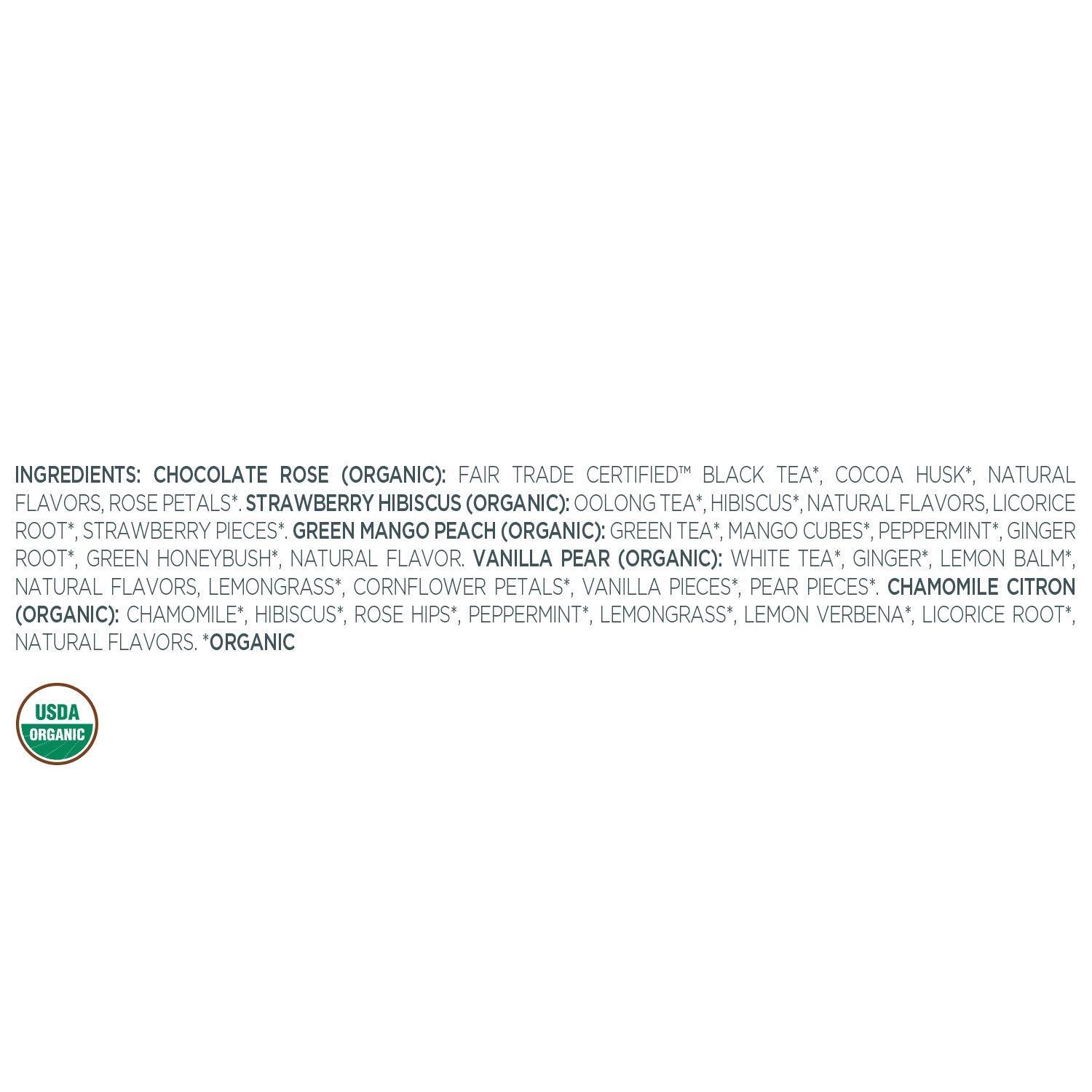 TEA BLENDS – Ginger Snap (black – caffeinated), Sweet Orange Sprice (black – caffeinated), White Ginger Pear (white – caffeinated), Harvest Apple Spice (herbal – caffeine free), and Winter Chai (herbal – caffeine free).