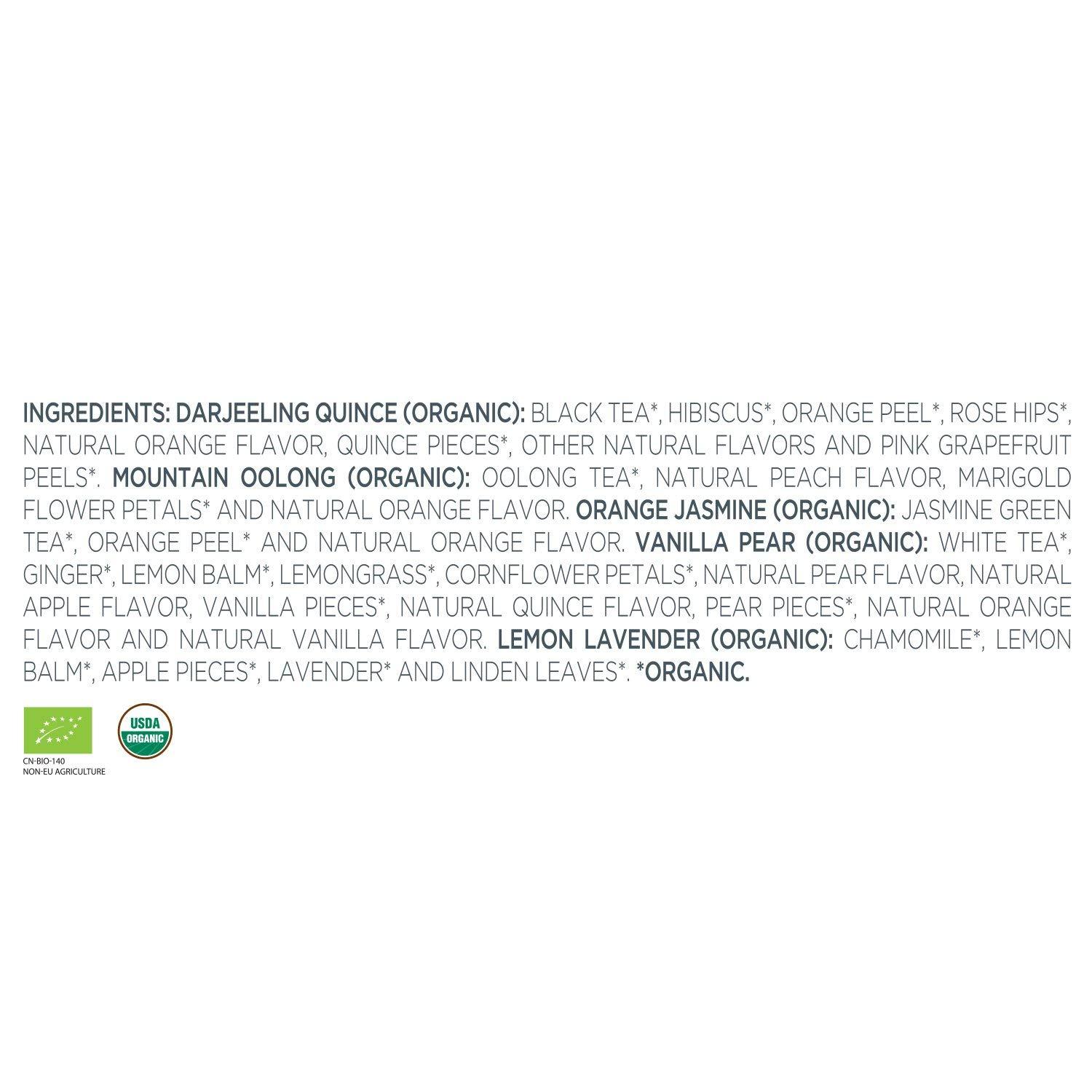TEA BLENDS – Ginger Snap (black – caffeinated), Sweet Orange Sprice (black – caffeinated), White Ginger Pear (white – caffeinated), Harvest Apple Spice (herbal – caffeine free), and Winter Chai (herbal – caffeine free).