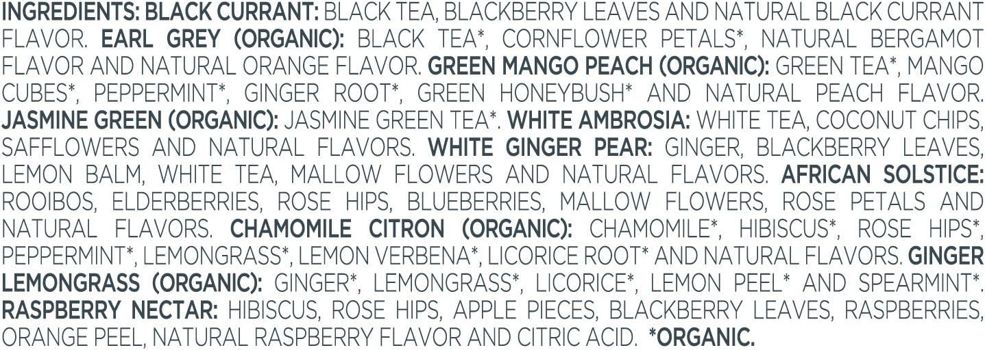 TEA BLENDS – Ginger Snap (black – caffeinated), Sweet Orange Sprice (black – caffeinated), White Ginger Pear (white – caffeinated), Harvest Apple Spice (herbal – caffeine free), and Winter Chai (herbal – caffeine free).