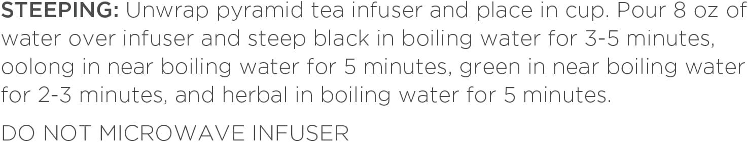 HOW TO STEEP – Unwrap the Pyramid Infuser, place into 8 ounces of boiled water. Pyramid infuser is not microwave safe.