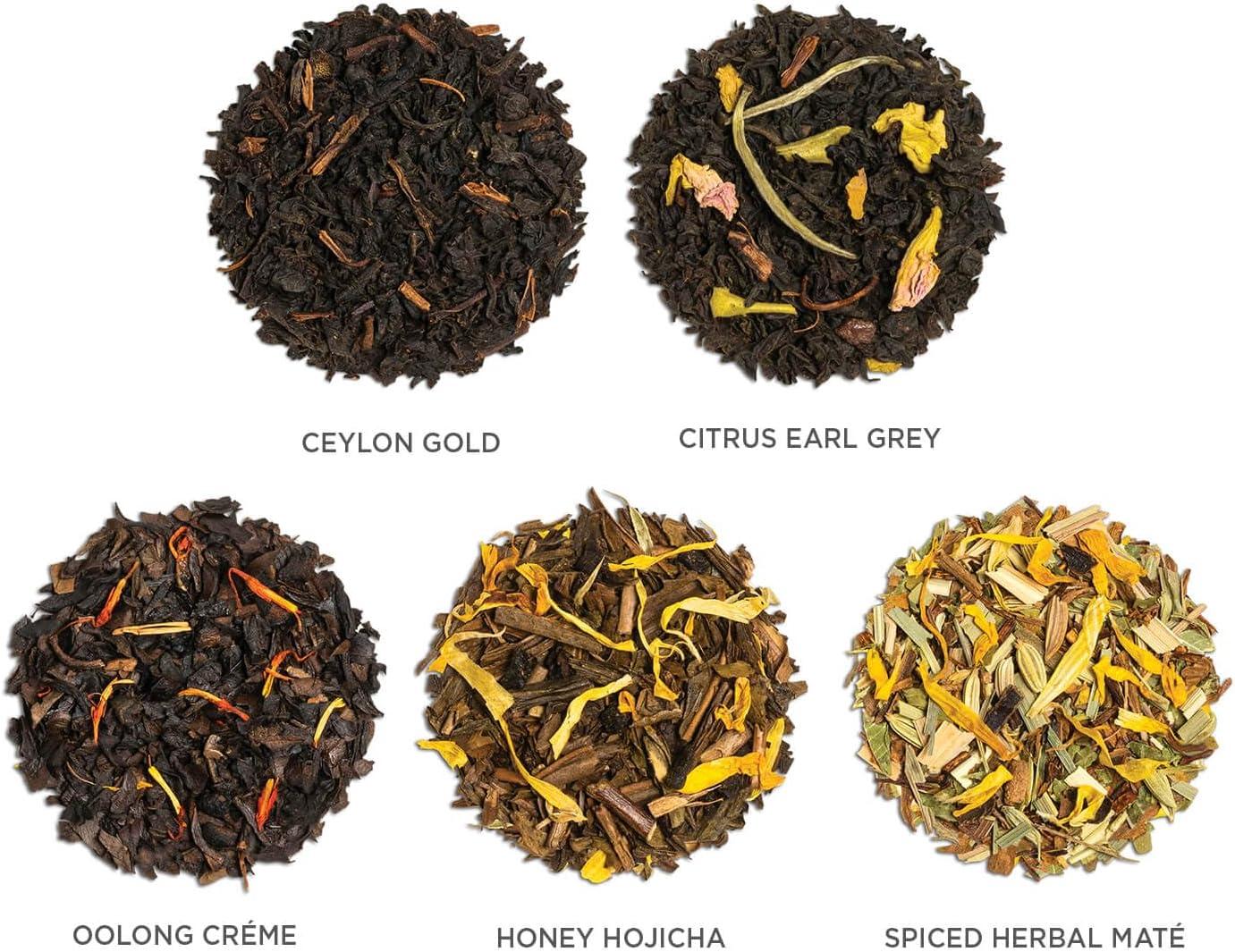 TEA BLENDS – Ginger Snap (black – caffeinated), Sweet Orange Sprice (black – caffeinated), White Ginger Pear (white – caffeinated), Harvest Apple Spice (herbal – caffeine free), and Winter Chai (herbal – caffeine free).