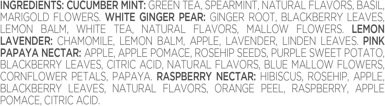 TEA BLENDS – Ginger Snap (black – caffeinated), Sweet Orange Sprice (black – caffeinated), White Ginger Pear (white – caffeinated), Harvest Apple Spice (herbal – caffeine free), and Winter Chai (herbal – caffeine free).
