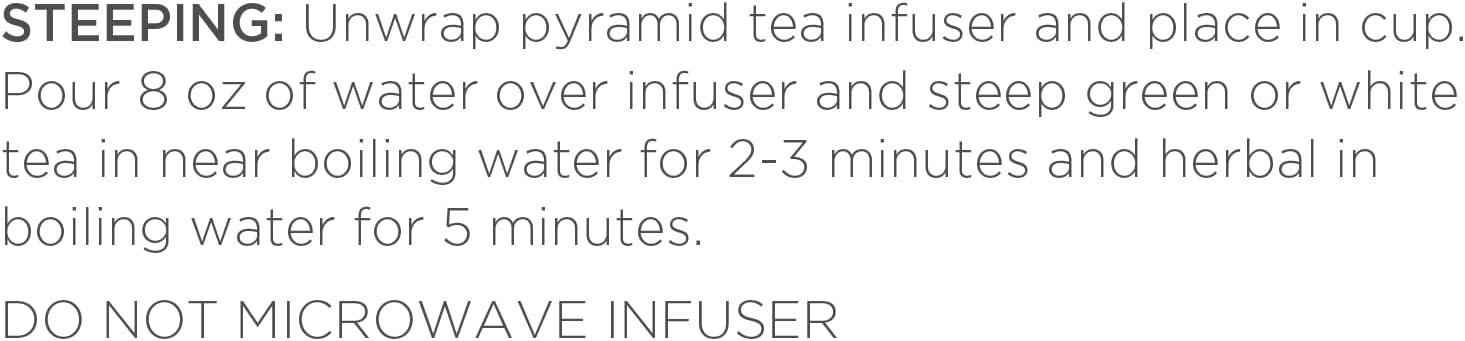 HOW TO STEEP – Unwrap the Pyramid Infuser, place into 8 ounces of boiled water. Pyramid infuser is not microwave safe.