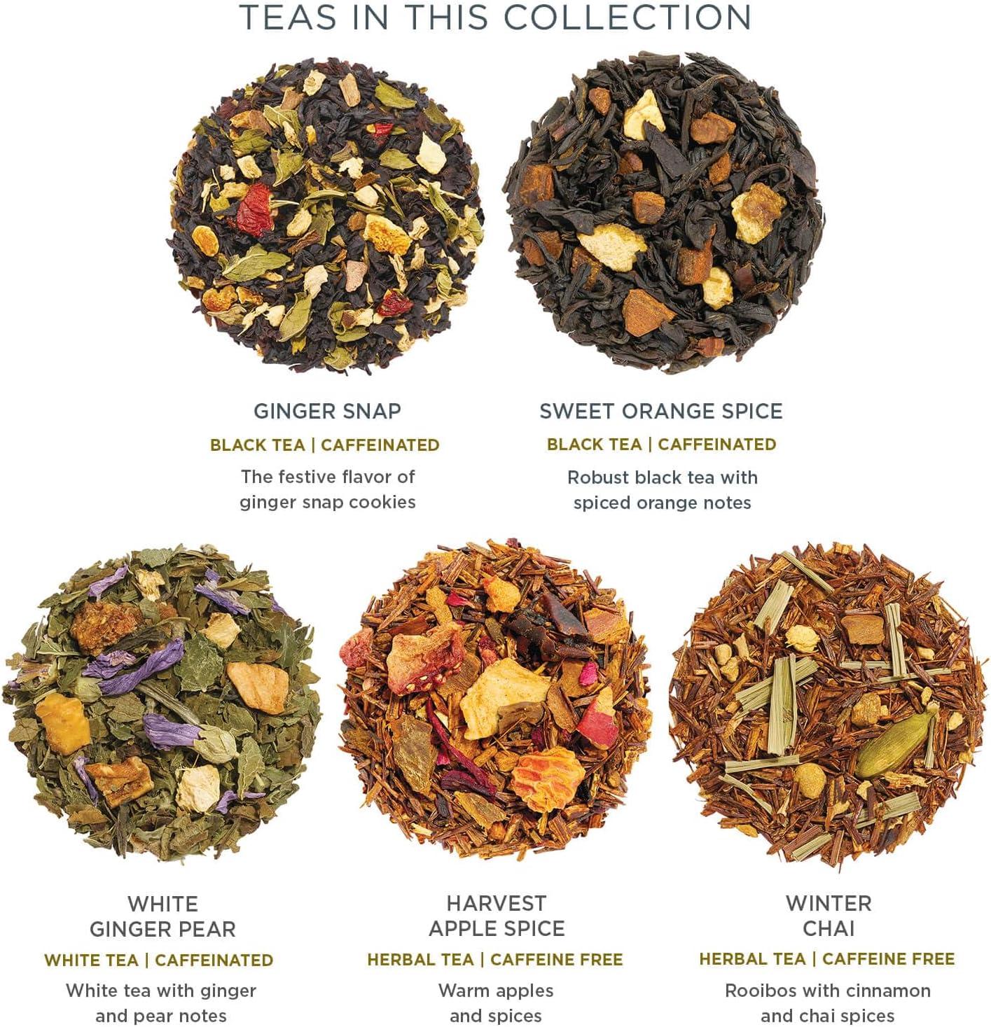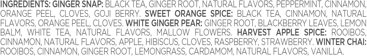 TEA BLENDS – Ginger Snap (black – caffeinated), Sweet Orange Sprice (black – caffeinated), White Ginger Pear (white – caffeinated), Harvest Apple Spice (herbal – caffeine free), and Winter Chai (herbal – caffeine free).