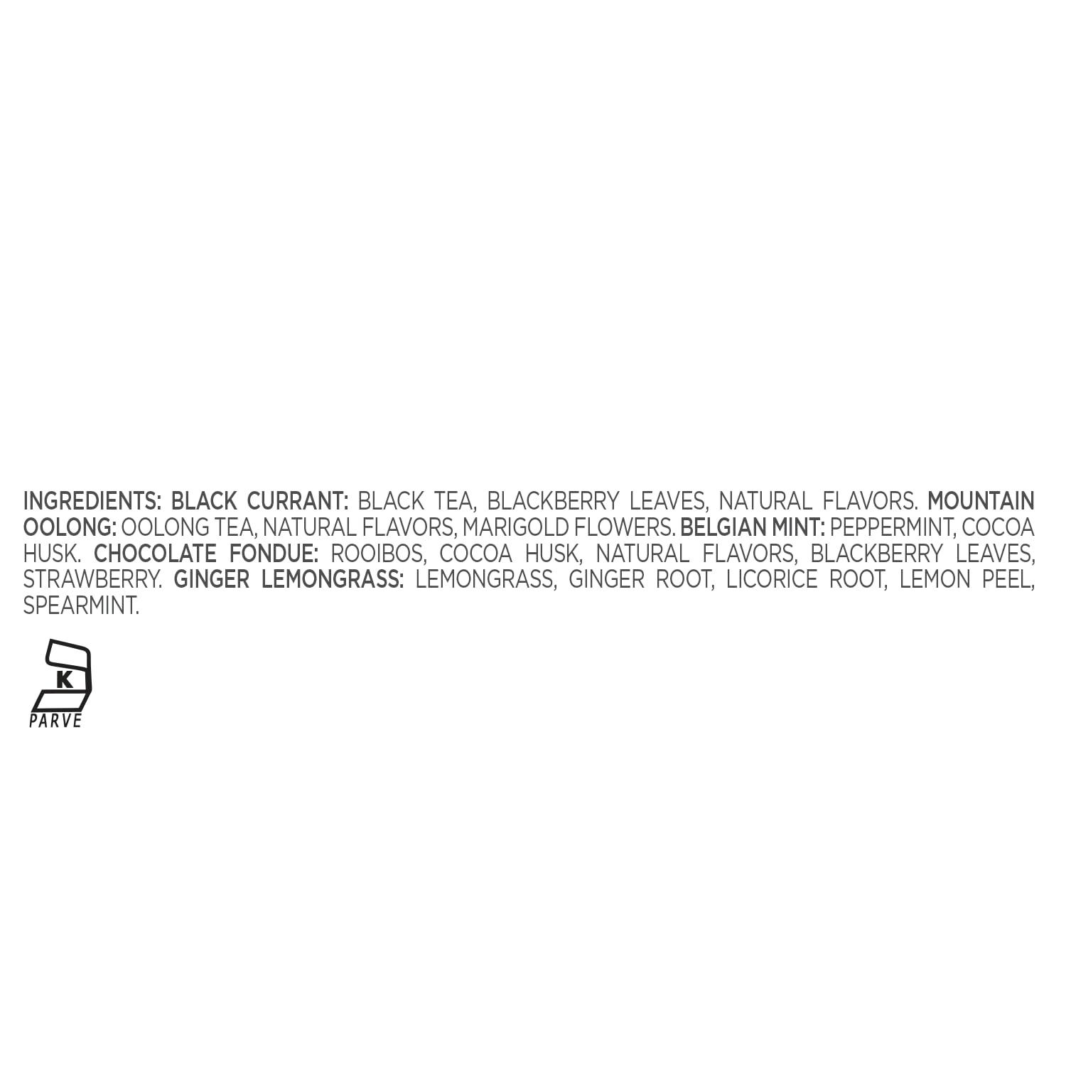 TEA BLENDS – Black Currant (black – caffeinated), Mountain Oolong (oolong – caffeinated), Belgian Mint (herbal – caffeinated), Chocolate Fondue (herbal – caffeinated), Ginger Lemongrass (herbal – caffeine free).